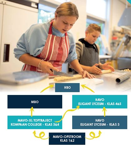 De mavo-opstroomklas is een tweejarig traject, waarin jij kunt ontdekken of de mavo-XL of de havo beter bij je past. Voordat je naar leerjaar 3 gaat, kies jij (samen in overleg met jouw coach en ouders/verzorgers) of je verder gaat leren via de mavo-XL op het Kompaan College of dat je de overstap maakt naar leerjaar 3 havo van het Eligant Lyceum.